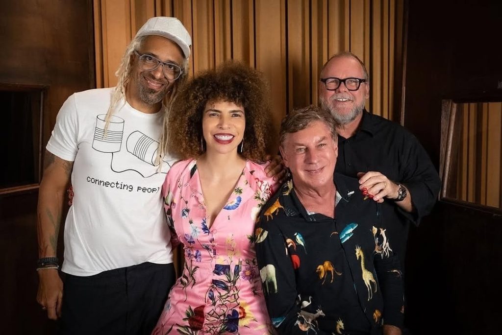 Flávio Venturini em estúdio com Jorge Espírito Santo (diretor do show, de boné), Vanessa da Mata e o empresário Steve Altit (à direita)