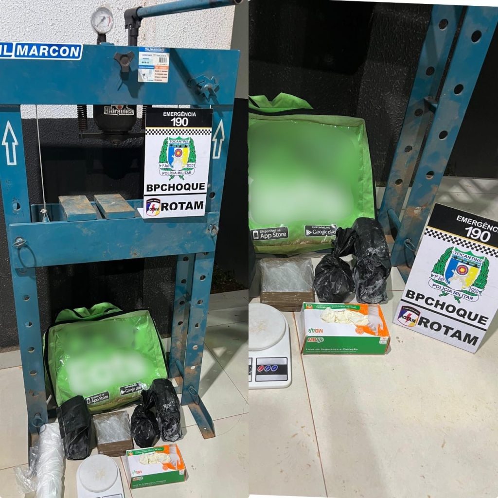 Conforme a Polícia Militar, na abordagem foram encontrados um tablete de cocaína de 1 kg e 24g, três pacotes de substância utilizada para mistura de cocaína, uma prensa hidráulica, cloridrato de lidocaína, uma caixa de luvas e um aparelho celular.
